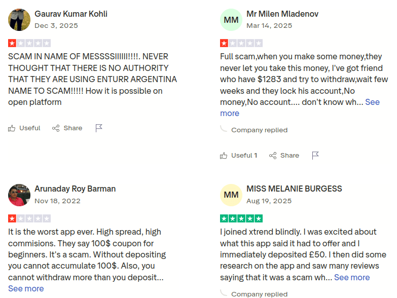 Reviews on Google Play appear favorable with a rating of 4.2, but the reality is that many users feel disappointed. A quick search on the TrustPilot website for XTrend Lite reveals less encouraging feedback. Numerous complaints highlight challenges with withdrawing funds, attributed to various issues such as banking support, customer service difficulties, accounts being locked due to bigger withdrawals and price manipulation. Additionally, some users have reported that their deposited money has gone missing, leaving them frustrated with the lack of response from customer support.